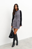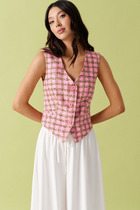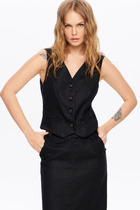 Жилет приталенного силуэта с застёжкой на пуговицы. Отложной воротник, по переду накрадные карманы  с клапанами. В комплекте идёт пояс.