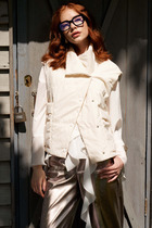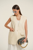 Жилет полуприлегающего силуэта из экокожи на хлопковой основе. Горловина и пройма обработана обтачкой. По переду нагрудная вытачка, переходящая в подрез с имитацией кармана. Застёжка на кнопки. Низ асимметричен. По спинке две вытачки и хлястик на резинке. Длина изделия 50 см.