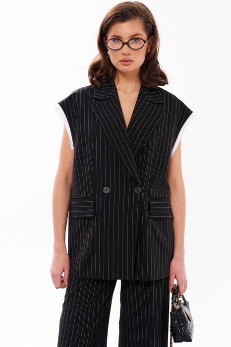 Жилет женский из смесовой ткани для повседневной носки. Жилет прямого силуэта. Жилет двубортный на одну обметанную петлю и одну пуговицу. Перед имеет две талиевые вытачки и два кармана с клапаном и двумя обтачками. Спинка разрезная с регулирующимся хлястиком. Горловина обработана пиджачным воротником. Жилет без рукавов, по пройме имеется вставка из другого материала. Жилет на поливискозной подкладке. Очень стильный жакет, в котором вы обязательно очаруете всех своим внешним видом. А главное в данном жилете вы всегда будете в центре внимания.