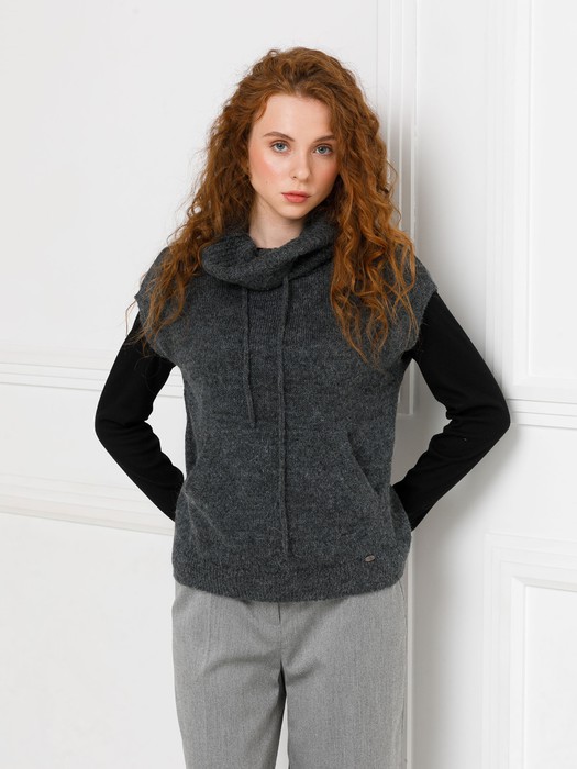 Модель прямого силуэта, со спущенным плечом. Спереди карман кенгуру. По низу отложного воротника стойки обработана кулиса со шнурком.