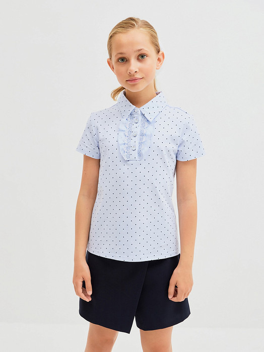 Школьная блузка в горошек для девочек сшита из мягкого и эластичного хлопкового трикотажа - материала подходящего для комфортной повседневной носки. Полуприлегающий крой. Короткие рукава. Спереди застежка на планку и пуговицы. Планка украшена шифоном и кружевом, имитируя воротник - жабо. Пуговицы в тон изделия с мерцающим кристаллом и обрамлением серебряного цвета.