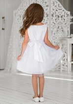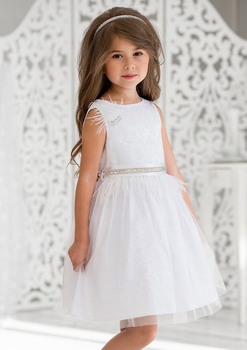 Праздничное платье классического кроя для маленьких принцесс. Лиф с круглым вырезом горловины и нижняя пышная юбка выполнены из ткани атлас-жаккард, с изысканым узором. Верхний слой юбки выполнен из сетки. Платье дополнено оригинальным атласным поясом-баской из воздушных перьев и очаровательной броши из таких же перьев, что придает ему изысканой элегантности.