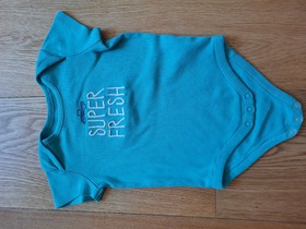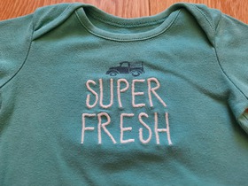 Б/У бодик известного, американского бренда Gymboree, Super Fresh Bodysuit. Боди с коротким рукавом для мальчика. Кнопки на ногах и воротник-конверт для удобного надевания. Трафаретная печать с вышивкой на груди. Машинная стирка. Цвет: Fresh Teal. Состав: 100% хлопок, в рубчик. Размер: 3-6 m для мальчика 3-6 месяцев, ростом 58,5–63,5 см, весом 5,5–7,5 кг. Состояние: б/у, хорошее (есть еле заметные пятнышки на лицевой стороне).