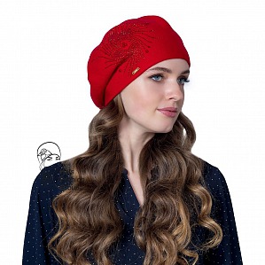 Женский двойной берет. Сбоку украшен композицией из страз, бусин и фирменной шильдой.