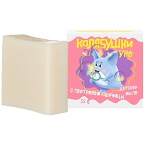 Детское мыло "Калябушки" не содержит продуктов животного происхождения и может быть использовано всеми членами семьи и для очищения кожи, и для застирывания одежды.