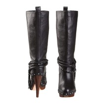 Новые демисезонные сапоги известного итальянского бренда Dolce Vita, Women's Henrietta Platform Boot. Брендовые стильные женские сапоги Dolce Vita, кожа класса люкс – одна из разновидностей старинного сафьяна; очень прочная, мягкая, ласкающая ноги, со сдержанным классическим природным рисунком и приятной рельефностью. С изогнутой пяткой на платформе, кольцо с кисточкой соединяет текстурированные ремешки с заклепкамина щиколотках со средней частью голени, сбалансированного на пятке и платформе с металлической отделкой серебристого цвета, заклепками на платформе, кожаная подкладка и стелька. Этот стиль без застежек отлично смотрится надетым поверх джинсов или мини. Цвет: Black. Состав: натуральная кожа 100%. Размер: 9 M US, 39 наш, высота каблука примерно 11,5 см, высота платформы примерно 32 мм. Без коробки.