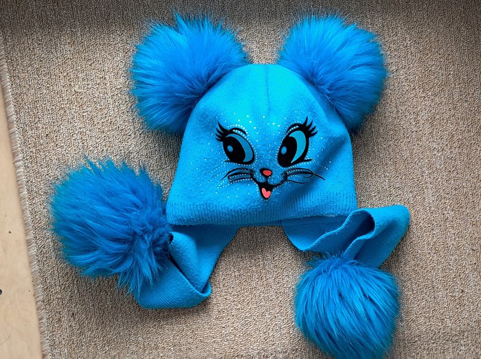 Детская шапка голубого цвета с изображением мордочки кота. Состояние хорошее, носилась регулярно, но сохранила внешний вид. Подходит для ребенка 4-6лет.